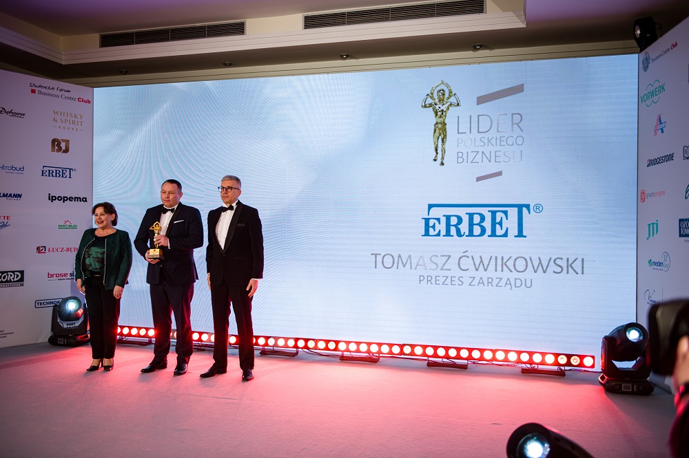 - Tomasz Ćwikowski, prezes firmy Erbet, odbiera Złotą Statuetkę Lidera Polskiego Biznesu