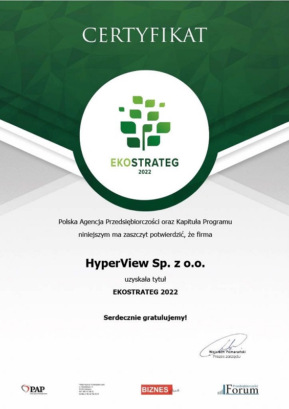 Podczas IX Kongresu Przedsiębiorczości firmy członkowskiej BCC prezes HyperView Sp. z o.o. Wojciech Jeszka odebrał nagrodę Ekostrateg 2022. Wyróżnienie przyznano za działania na rzecz ochrony środowiska. Nagroda jest wyrazem uznania za dotychczasowe osiągnięcia i zachętą do dalszych działań na rzecz ochrony naszej planety.