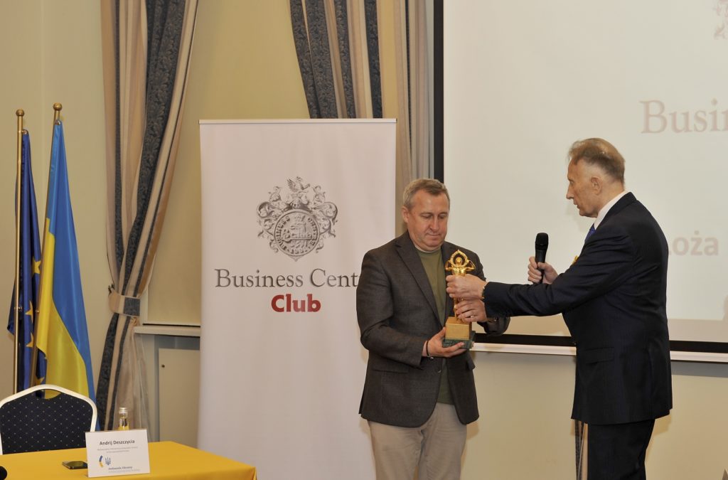 Po przedstawieniu dostojnych gości Prezes Business Centre Club Marek Goliszewski wręczył Jego Eminencji Ambasadorowi Andrijowi Deszczycy specjalną Złotą Statuetkę BCC dla prezydenta Ukrainy Wołodymyra Zełenskiego. – W imieniu środowisk skupionych w BCC, członków – przedsiębiorców ale także organizacji pozarządowych, obywatelskich poprosić pana Ambasadora, żeby z naszych rąk przyjął ten oto symbol zwycięstwa dla pana prezydenta Wołodymyra Zełenskiego. Ta statuetka odzwierciedla zwycięskiego olimpijczyka i myślę, że odzwierciedla ona nasze życzenia dla Ukrainy, dla pana Prezydenta, pana Ambasadora i wszystkich kolegów, którzy decydują o tym jak walczyć na tej wojnie. Ale jest też odzwierciedleniem naszych wzajemnych obrotów gospodarczych, które sięgnęły w ubiegłym roku 48 mld złotych. Mamy nadzieję, że będziemy się dalej skupiać na tym, żeby tę współpracę rozwijać, to spotkanie jest tego przykładem – powiedział Prezes Marek Goliszewski.