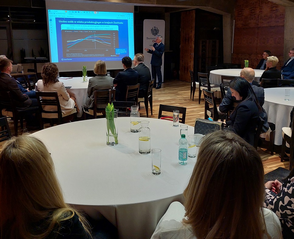 Gościem specjalnym był dr Marcin Mrowiec, główny ekonomista Grant Thornton, który omawiał wyzwania demografii na światowych rynkach, w tym Polski, z perspektywy menedżera firmy. Zebrani wspólnie zastanawiali się i dyskutowali, co nas czeka w 2024 roku i co można zrobić, aby sprostać wyzwaniom demografii.