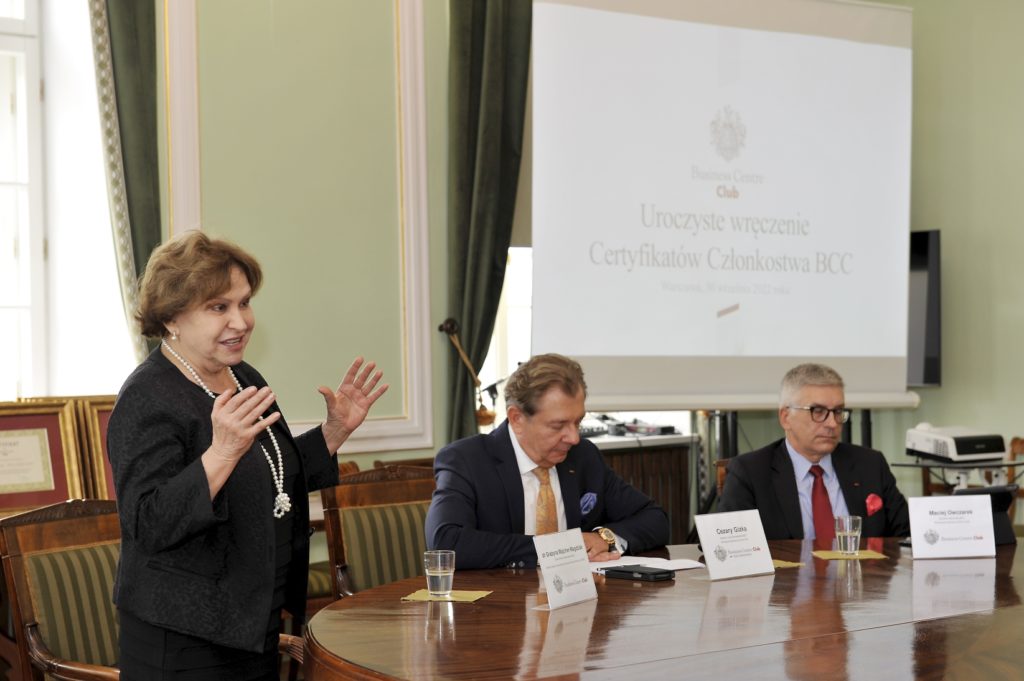 W dniu 30 września 2022 r. w Sali Okrągłego Stołu Pałacu Staszica w Warszawie odbyło się uroczyste powitanie i wręczenie certyfikatów nowym członkom Loży Warszawskiej Business Centre Club. Nowi członkowie Klubu zostali powitani przez Kanclerza Loży Warszawskiej – Cezarego Gizkę, Grażynę Majcher-Magdziak – członka Rady Organizatorów BCC oraz Macieja Owczarka – Dyrektora Generalnego Business Centre Club.